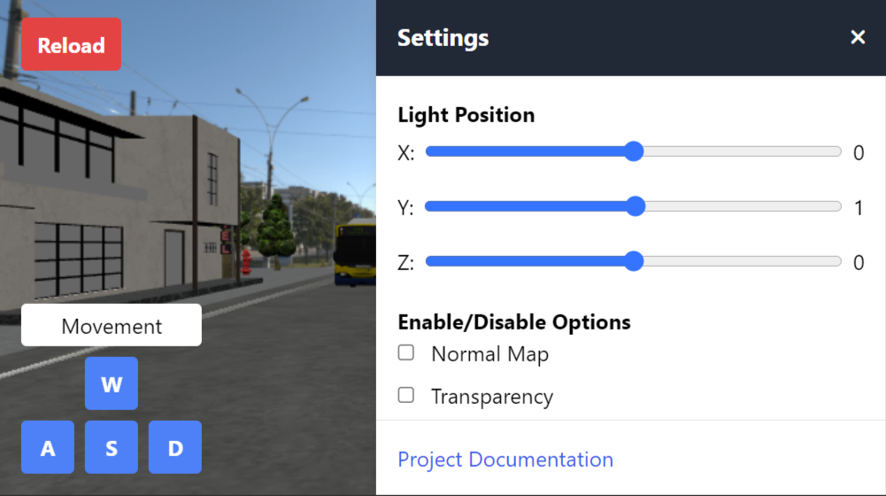Tutti i comandi e le impostazioni del progetto possono essere visualizzate nell'apposito menu laterale. L'utente ha la possibilità di personalizzare vari aspetti del progetto. Tra le opzioni disponibili, regolare la posizione delle luci, selezionare le preferenze per il rendering della scena e visualizzare i comandi. Queste impostazioni sono facilmente accessibili e permettono di adattare l'esperienza alle proprie esigenze e preferenze.